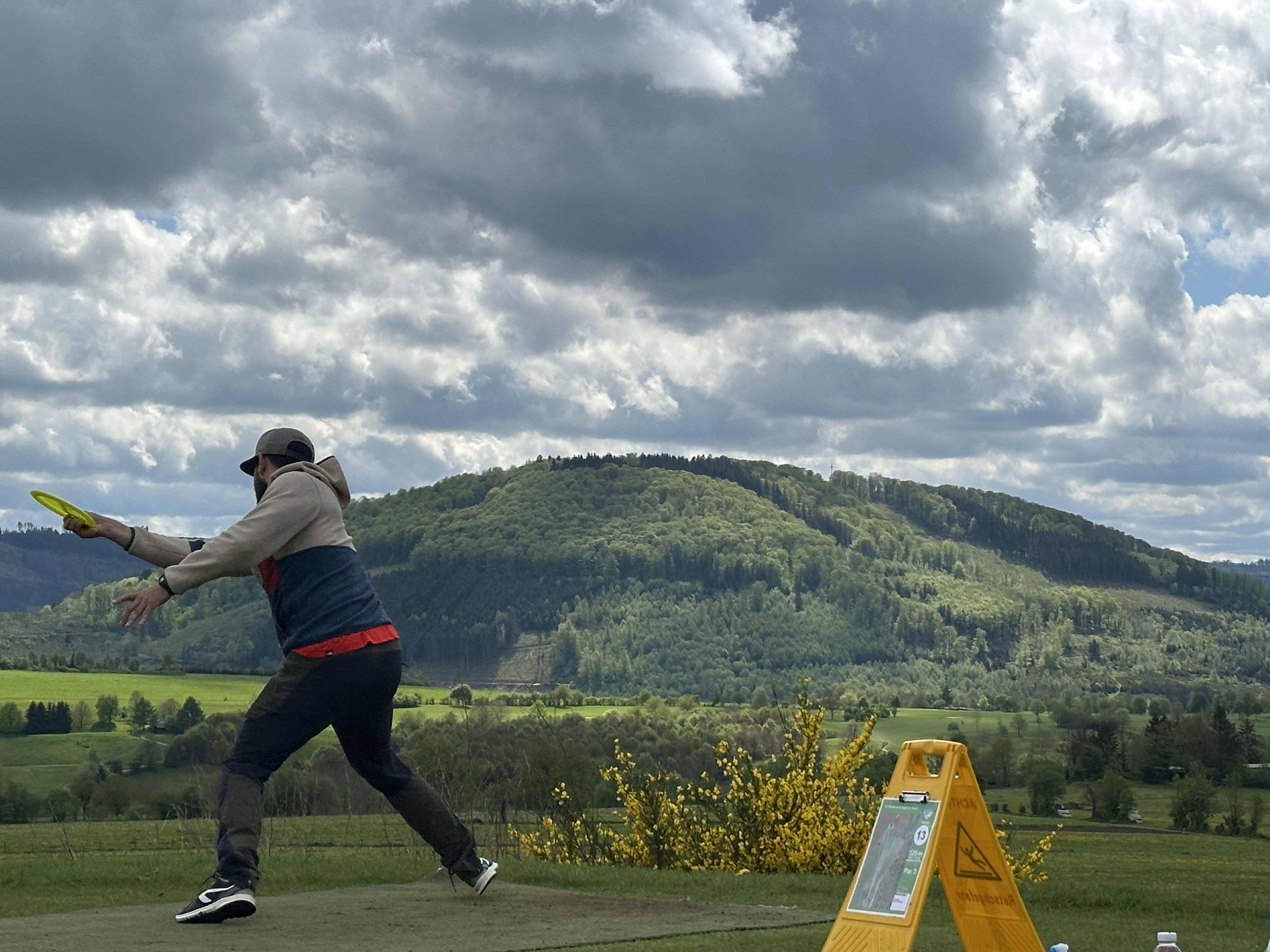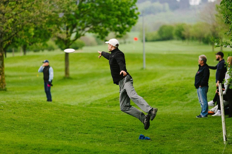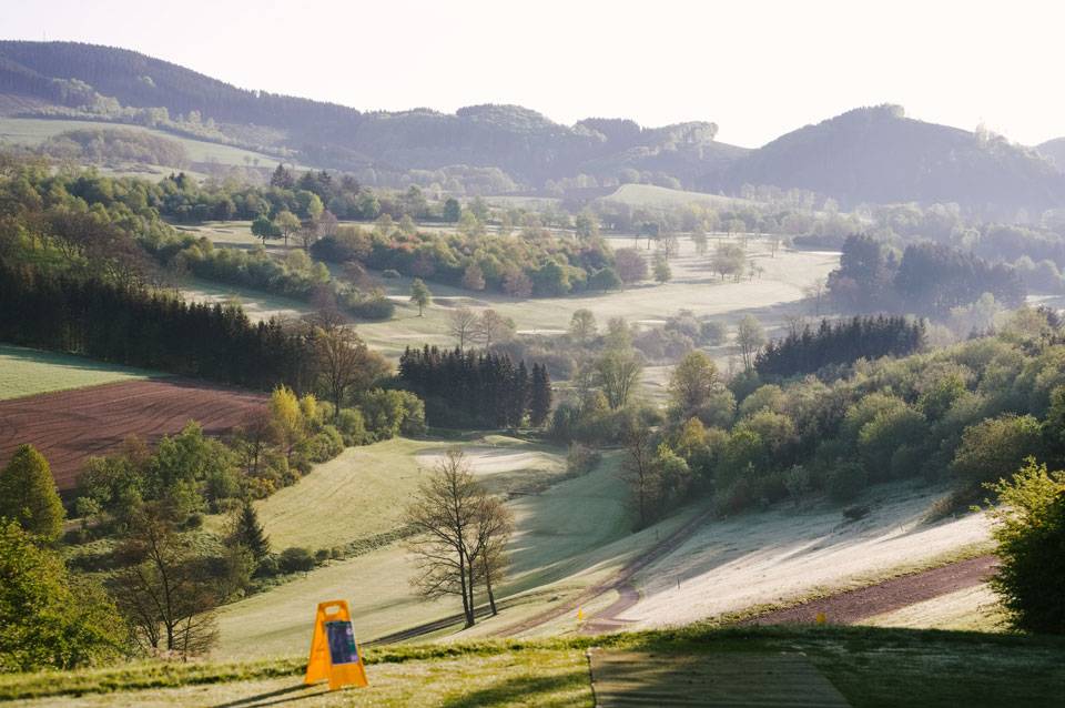 Am Donnerstagmorgen machten wir uns mit einem voll beladenen Smart – gepackt mit Discgolf-Scheiben sowie Regen- und Sommerkleidung, da das Wetter als wechselhaft vorhergesagt war – auf den Weg ins idyllische Sauerland. Im Golfclub Schmallenberg angekommen, taten wir uns am Tee der ersten Bahn mit Björn und Lukas zusammen, die ebenfalls nur für die Proberunde angereist waren. Die Sonne strahlte und die Bedingungen waren perfekt. Ich spielte eine +1 und setzte damit die Messlatte für die erste Turnierrunde.