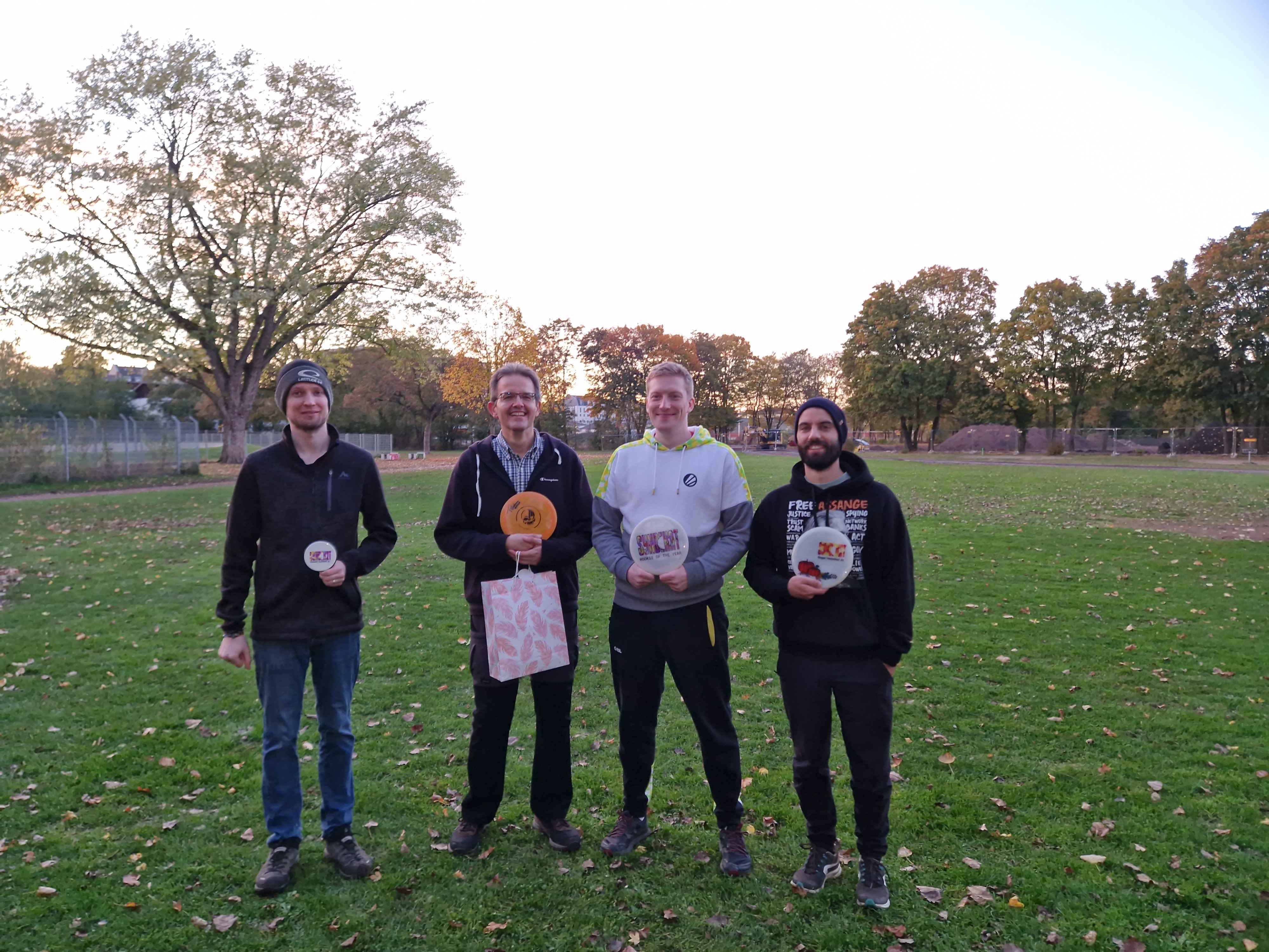 Im Anschluss folgte die Singles-Runde, bei der alle Teilnehmenden einzeln antraten. Hier setzte sich Max, ein Mitglied des Disc Golf Syndikats, mit einem Score von -4 durch. Die Ergebnisse lagen insgesamt dicht beieinander, und die Runde bot einen schönen sportlichen Abschluss für alle Spieler*innen.